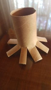 Toilet roll spiders. Stamping is fun! All you have to do is take a toilet roll and cut the bottom into eight legs. Place it in black paint and stamp away! I found you really had to press the legs firmly to get a print.