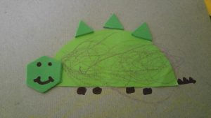 Shape dinosaurs. Cut a semicircle for the dinosaur’s body. Use foam to cut out his head (hexagon) and scales (triangles) and let the kid stick them on. Some kids stuck them in the middle which gave the dinosaur a cute angle from a different perspective.